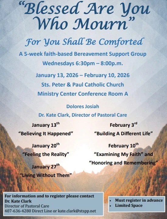The Bereavement Ministry assists individuals or families in planning and coordinating funeral liturgies. Bereavement Ministers support individuals or families during this difficult time. A remembrance prayer service is held each year on All Souls Day for those who have lost a loved one.